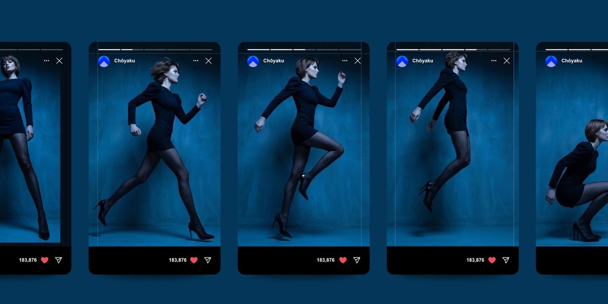 A first social media campaign was devised to maximise the relatively small screen sizes of viewers by minimising clutter and providing a direct focus on the garments in use. Keyframes were extracted from footage to create a constant scroll animation (which would occur when the user held down their finger on the post to flip through the 'carousel'). As word spread of this effect, posts attracted far more engagement than videos or static images alone, with repeat viewings and exponential sharing. A second campaign featured a more classic catalogue view, recreated with the same colours and atmosphere, which reflected website branding and offered direct-to-consumer purchase options within the app.